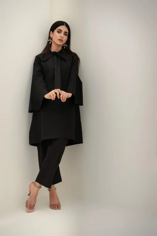 Elegant Black Kurti with Pearl Embellished Abstract Detailing – Modern Semi-Formal Look