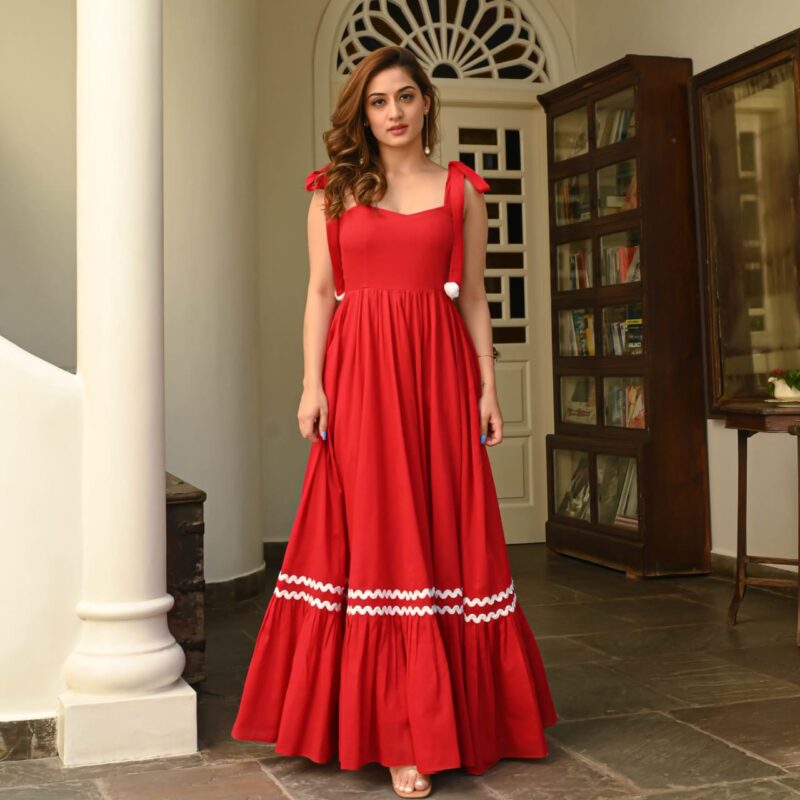 Women’s Red Tie-Strap Maxi Dress with White Trim Detailing