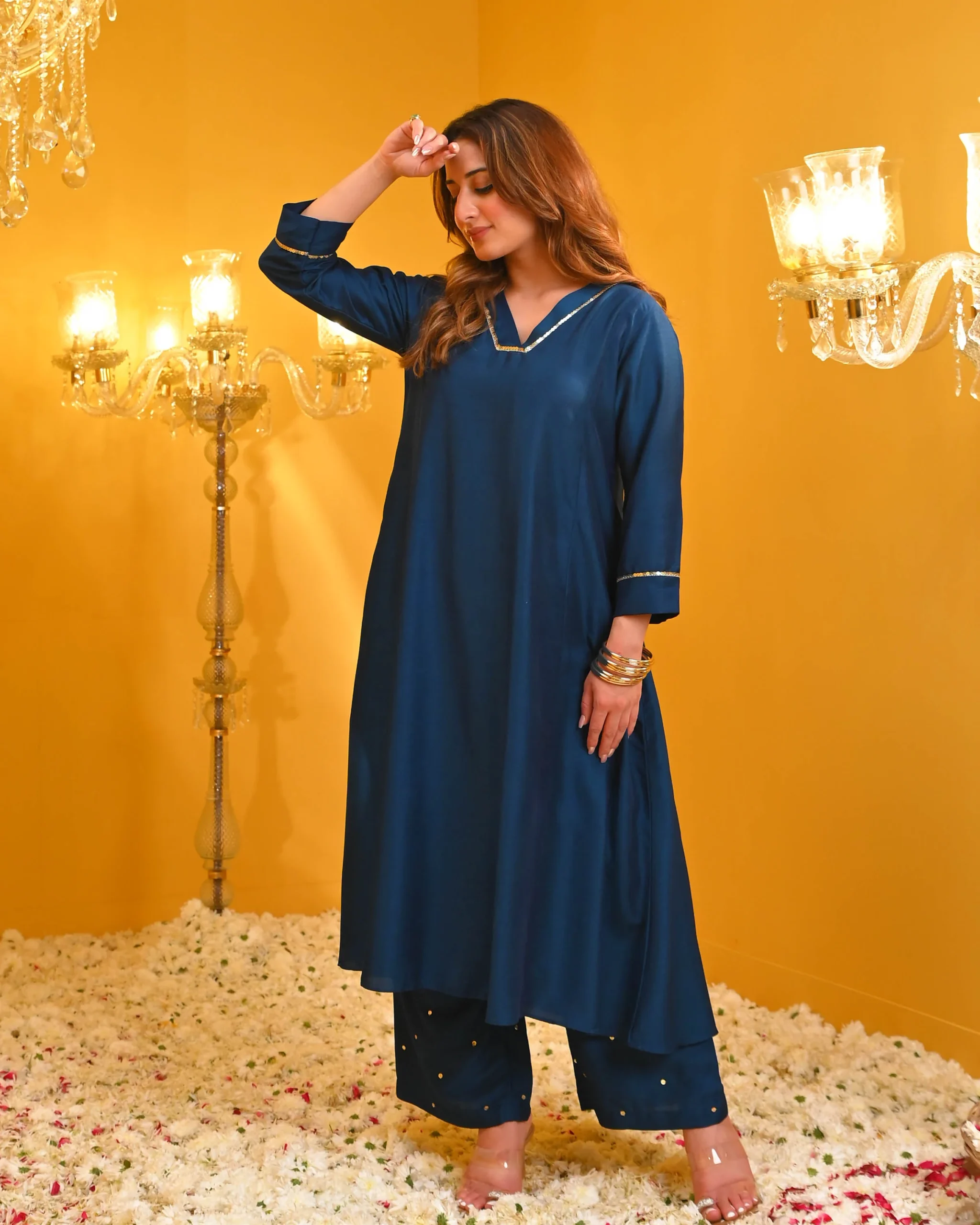 This Teal Blue Kurta Set brings a subtle statement to your festive or semi-formal wardrobe. With a clean silhouette and minimal gold dot detailing on the pants, this ensemble is perfect for those who love classic elegance with a modern touch.