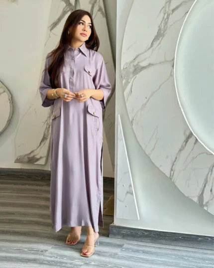- Round Neck and Button-Down Top: A clean, minimalist design with functional buttons for a classic look.