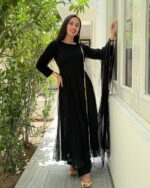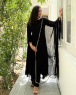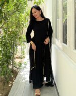 Make a graceful statement in this timeless Black Anarkali Kurta Set, tailored for elegance and comfort. Featuring a flared kurta with subtle golden embellishments, paired with straight pants and a flowy dupatta with delicate gota detailing.