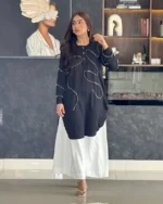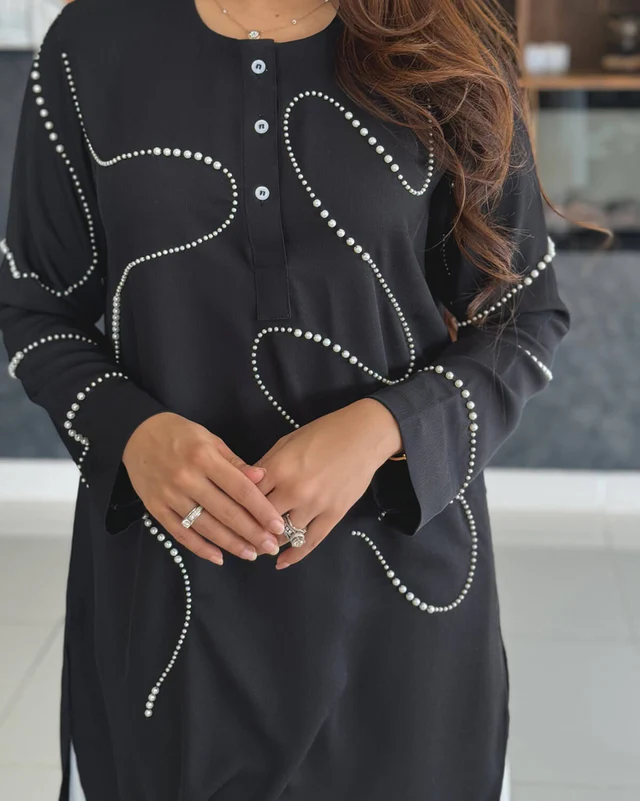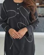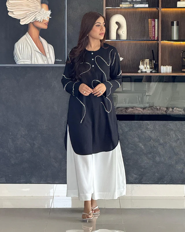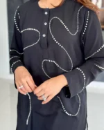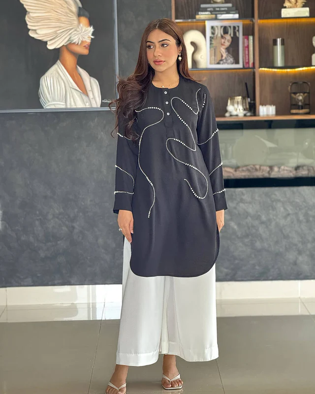 Stand out with elegance in this black kurti designed with abstract pearl embroidery detailing. The minimal design with wavy bead work adds a refined twist to a classic silhouette. Perfect for semi-formal events, workwear, or festive get-togethers.