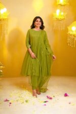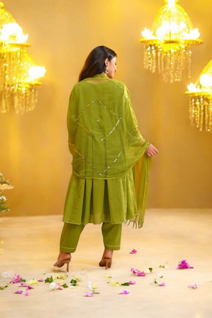 This stunning green kurti set with matching trousers and dupatta is designed to bring a festive and traditional charm to your wardrobe.