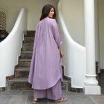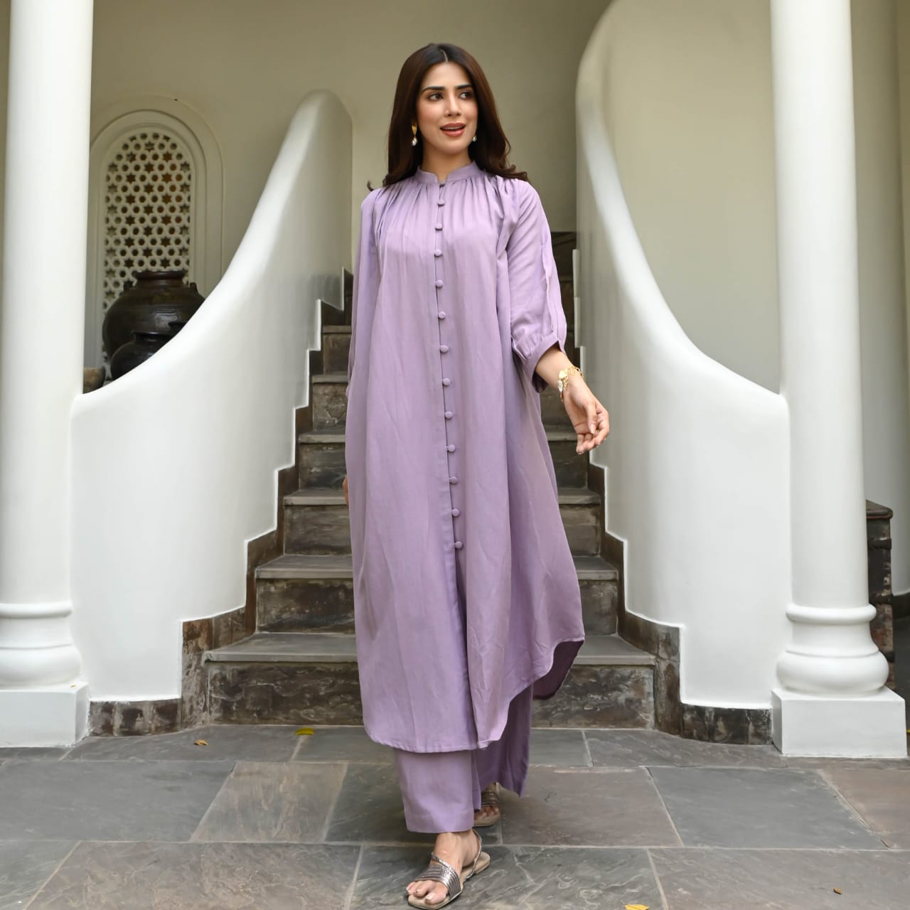 Add a touch of sophistication to your wardrobe with this Lavender Cotton Slub Two-Piece Kurta Set. The long button-down kurta is designed with a graceful fall and full sleeves, paired with comfortable matching pants for a complete look. Crafted from premium cotton slub, it ensures breathability and all-day comfort, making it a versatile choice for casual outings, gatherings, or office wear.