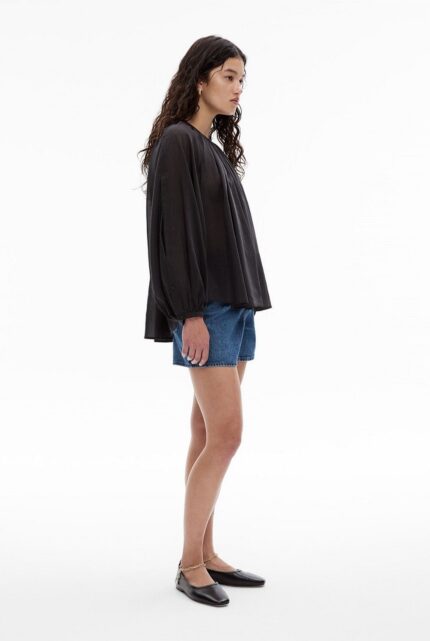 The voluminous balloon sleeves with subtle cuffs give it a dreamy, ethereal vibe – perfect for pairing with denim skirts, high-waisted trousers, or palazzos.