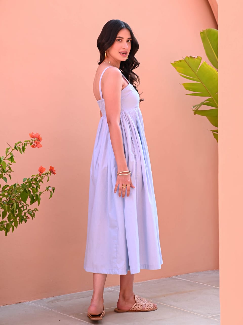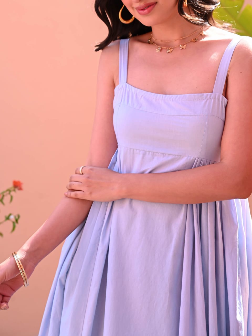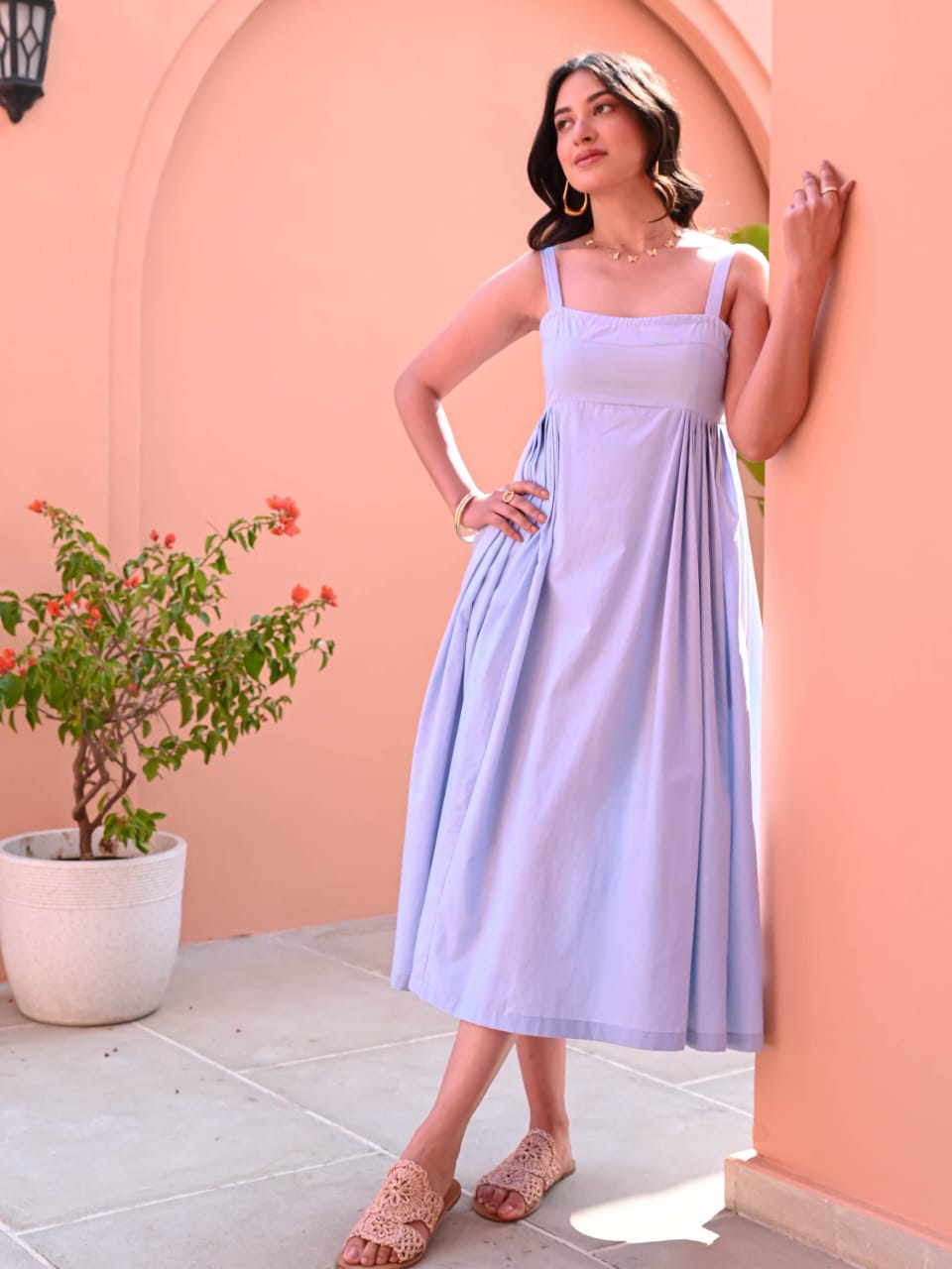 Soft, graceful, and effortlessly chic — this light blue midi dress is the perfect choice for brunches, day outings, or casual meetups. Made from breathable cotton, it features a square neckline with thick shoulder straps and relaxed pleated side panels that provide movement and charm. The midi length gives it a versatile and modest look, while the simplicity allows it to be dressed up or down.