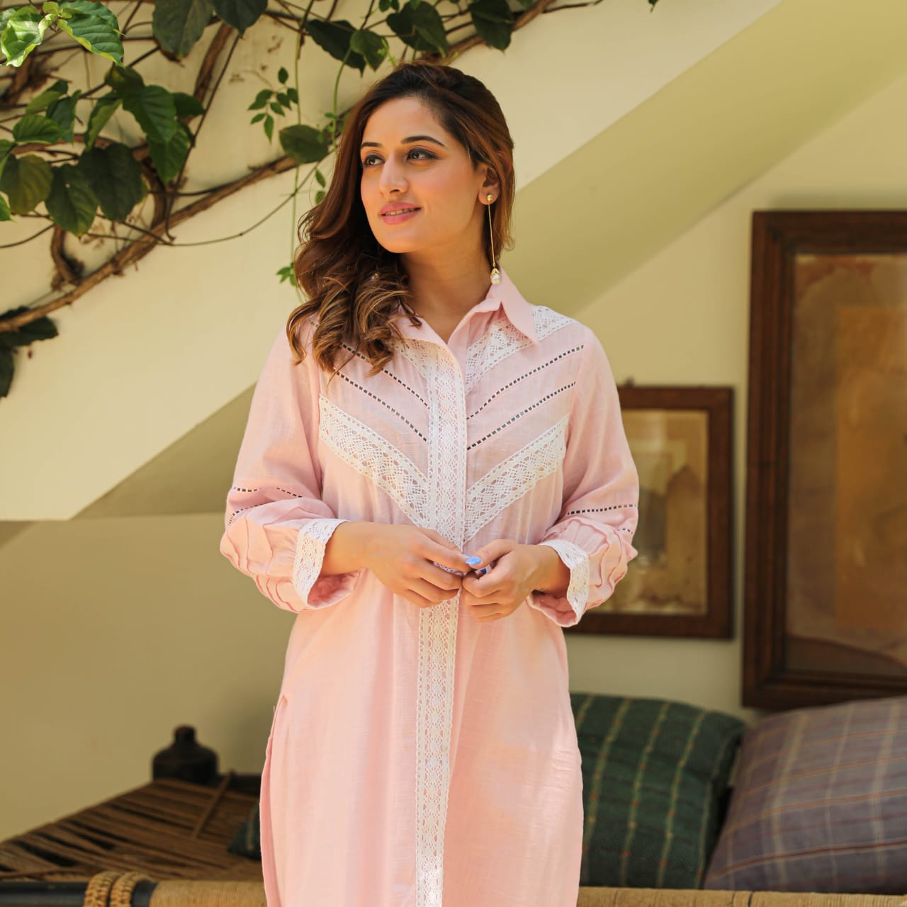This elegant Light Pink Cotton Kurta Set is designed for a chic and comfortable look. Made with premium breathable cotton fabric, it comes with a straight kurta and matching trousers. The kurta features delicate lace detailing, button-down front, and full sleeves, making it perfect for casual outings, office wear, or small gatherings. Pair it with transparent block heels (as shown) or juttis for a complete ethnic yet modern look.