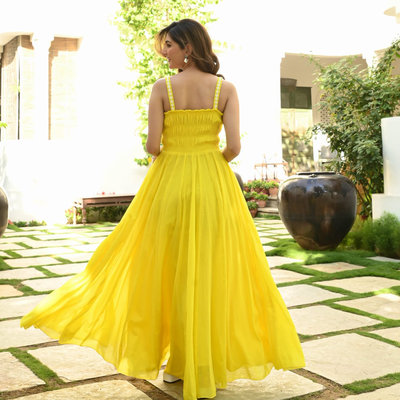 Brighten up your wardrobe with this radiant yellow maxi dress, designed to keep you stylish and comfortable throughout the day. Featuring a smocked bodice and relaxed flowing skirt, this dress offers a flattering silhouette for all body types. The spaghetti straps are detailed with a subtle embellishment for a feminine touch. Made with breathable fabric, it’s the perfect choice for summer outings, brunches, vacations, or casual parties.