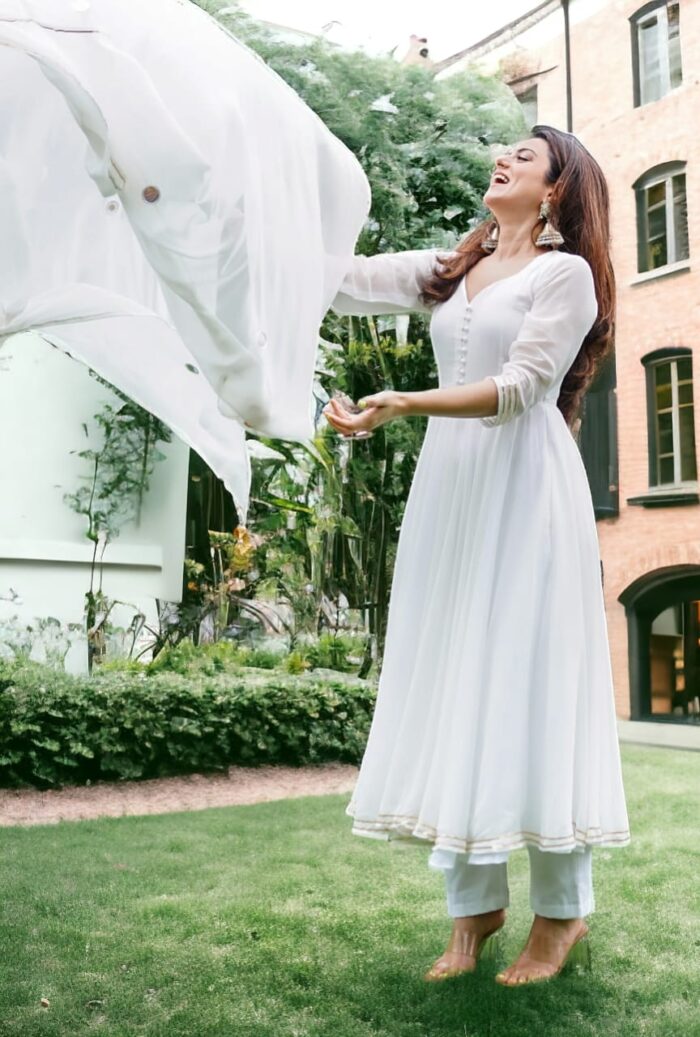 • Pants: Straight-cut pants in matching white georgette for a seamless and elegant look.