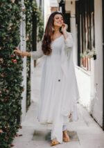 Embrace timeless grace with our White Anarkali Kurta Set, a luxurious blend of tradition and elegance. Crafted from high-quality georgette fabric, this exquisite set includes a beautifully tailored Anarkali kurta, straight-cut pants, and a statement dupatta. The kurta features delicate golden strip detailing on the sleeves and hem, adding a touch of regal allure to its pure white canvas. The structured Anarkali silhouette drapes beautifully, creating an effortlessly graceful look that’s flattering on all body types.