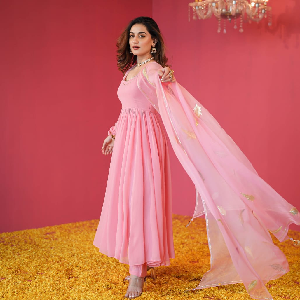 Make a graceful statement with this pink Anarkali maxi dress, designed for festive elegance and comfort. Crafted from soft, flowy georgette-style fabric, the dress features a fitted bodice with scoop neckline, long sleeves, and a voluminous flared skirt that drapes beautifully.